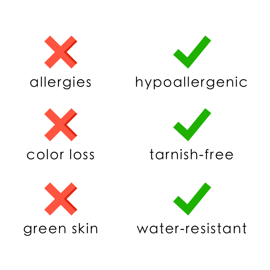 • Water, Sweat, and Heat Resistant. (No discoloration, No Tarnishing).